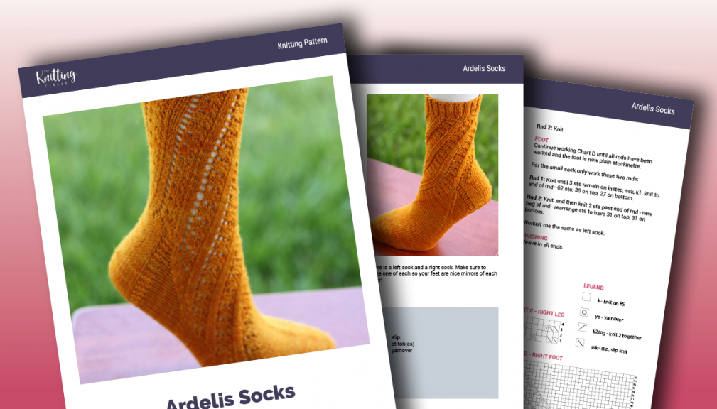You Save 67%The Ardelis Socks by Corrina Ferguson feature spiraling eyelet lace that is mirrored and ends on the tops of the feet. Worked up in a single skein of stunning solid fingering-weight yarn, the spiraling lace pattern helps the socks stay up on your legs.