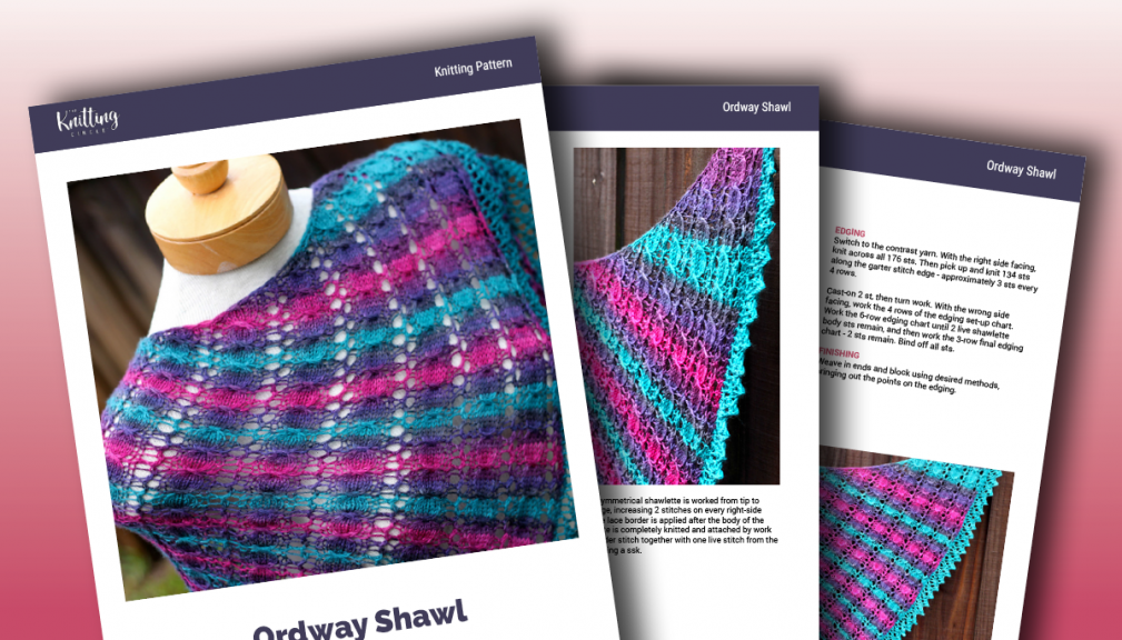 The Ordway Shawl by Corrina Ferguson is knit using one skein of a self-striping fingering weight yarn paired with a coordinating solid skein. It’s worked asymmetrically from tip to long edge with a simple applied edging worked after the triangle is finished. Perfect for self-striping or gradient yarns, the lace/cable rib pattern creates a strong diagonal against the stripes. This pattern would even be wonderful for using up leftovers - create your own stripe pattern!