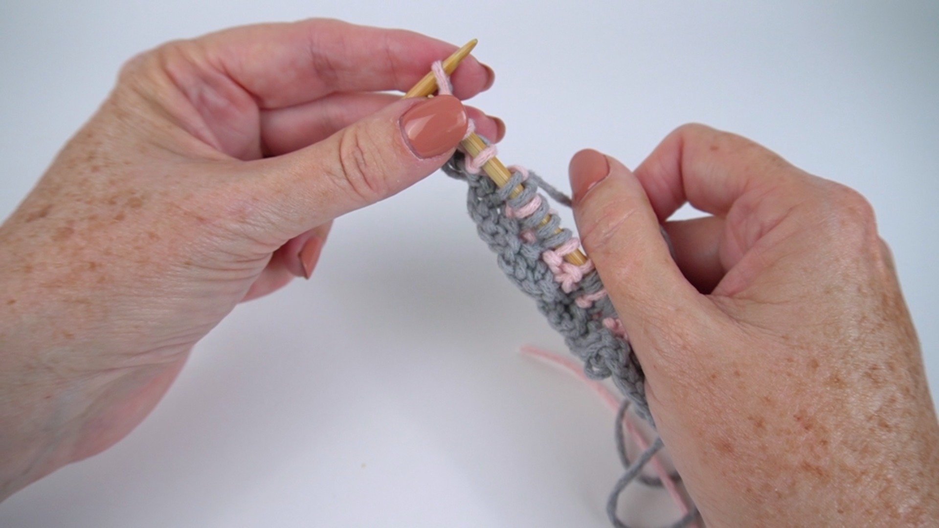 Mary Beth continues working the pattern, working through Row 6. She demonstrates how to attach the new yarn color on Row 3, simply by starting to knit with it while leaving a 4-to-6-inch tail to weave in when the project is finished.